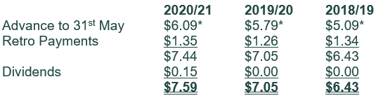 The current payout for the 2020/21 season of $7.60 per kgMS is an increase on the 2019/20 payout of $7.14. From a tax and cashflow point of view, allowing for the final dividend of $0.05 for 2019/20 and an interim dividend of $0.10 for the 2020/21 year, the payout profile is as follows: