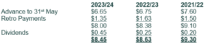 The first instalment of provisional tax for the 2024 year for a May balance date farming client will be 28th October 2023. Due to the spread of work through the year we will not have completed all tax returns by this provisional tax payment date, therefore the default payment expected by the IRD will be one third of 110% of the 2022 taxable income. Currently the Fonterra payout is forecast to be $7.90 plus anticipated dividends of 45 cents.